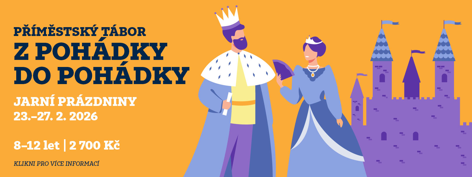 Pohádkový tábor pro děti z MŠ a ZŠ s celotáborovou hrou Z pohádky do pohádky. Pan král spolu s dalšími pohádkovými postavami provede děti každým dnem jinou pohádkou. Děti čekají různé dobrodružné nástrahy, se kterými se budou muset vypořádat. Budou vyrábět vzácné dary a plnit si jimi svou královskou truhlici. Na závěr pohádkové cesty budou všechny děti panem králem odměněny. Čas programu: Program tábora běží denně od 8:00 do 16:00 hodin Hlídání dětí: Hlídání dětí je zajištěno od 6:30 do 8:00 hodin a od 16:00 do 17:00 hodin. Cena: Celý tábor: 2 700 Kč V ceně je zahrnuto: Stravování, doprava, vstupné, materiál, odměny a ceny, pedagogický a zdravotnický doprovod, pojištění. Příslušnou částku uhraďte do 15. 2. 2026. Storno podmínky jsou součástí příslušného organizačního řádu. Přihlášky a informace: Budova A, Místek, Telefon: 558 111 777, E-mail: tabory(zavináč)klicfm.cz